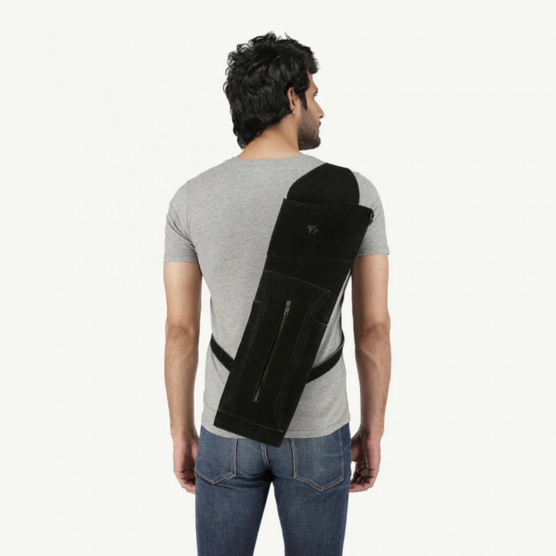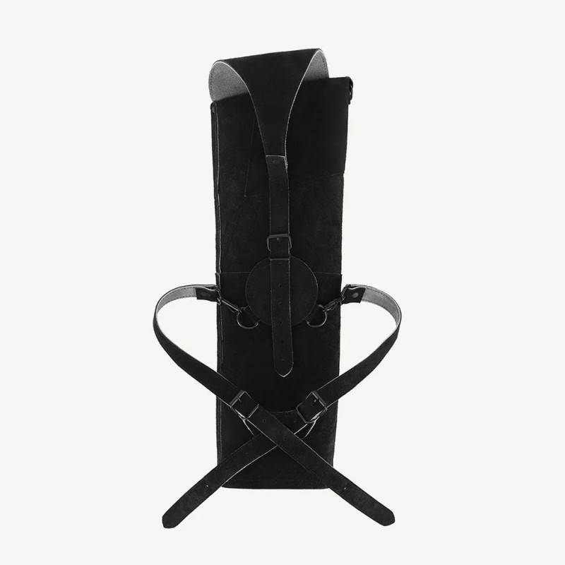 Kołczan został wykonany w całości z wysokogatunkowej zamszowej skóry bydlęcej w kolorze głębokiej czerni.